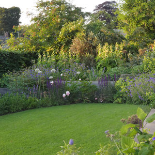 The front garden has been reimagined with a seamless extension of the pathway around the property, now forming a large outdoor terrace for relaxation and entertainment. Steps leading down to the lawn ease transitions across the site, while a raised sleeper bed has been strategically installed to manage the natural level changes within the garden. Thoughtful landscaping integrates these hardscape elements with vibrant planting, ensuring year-round interest. From the early blooms of Narcissus 'Thalia' and Tulipa 'Purple Prince' in spring to the structural presence of Phlomis russeliana and Salvia nemorossa 'Cardonna' in summer, the garden evolves with the seasons.